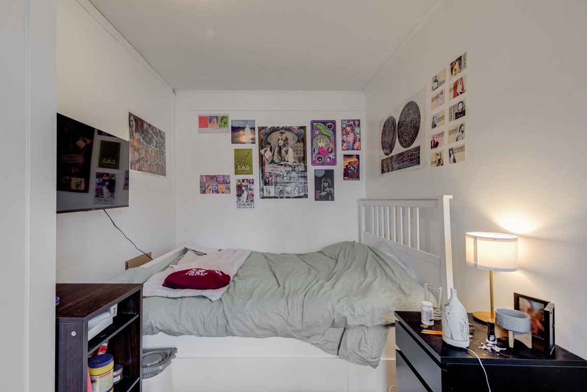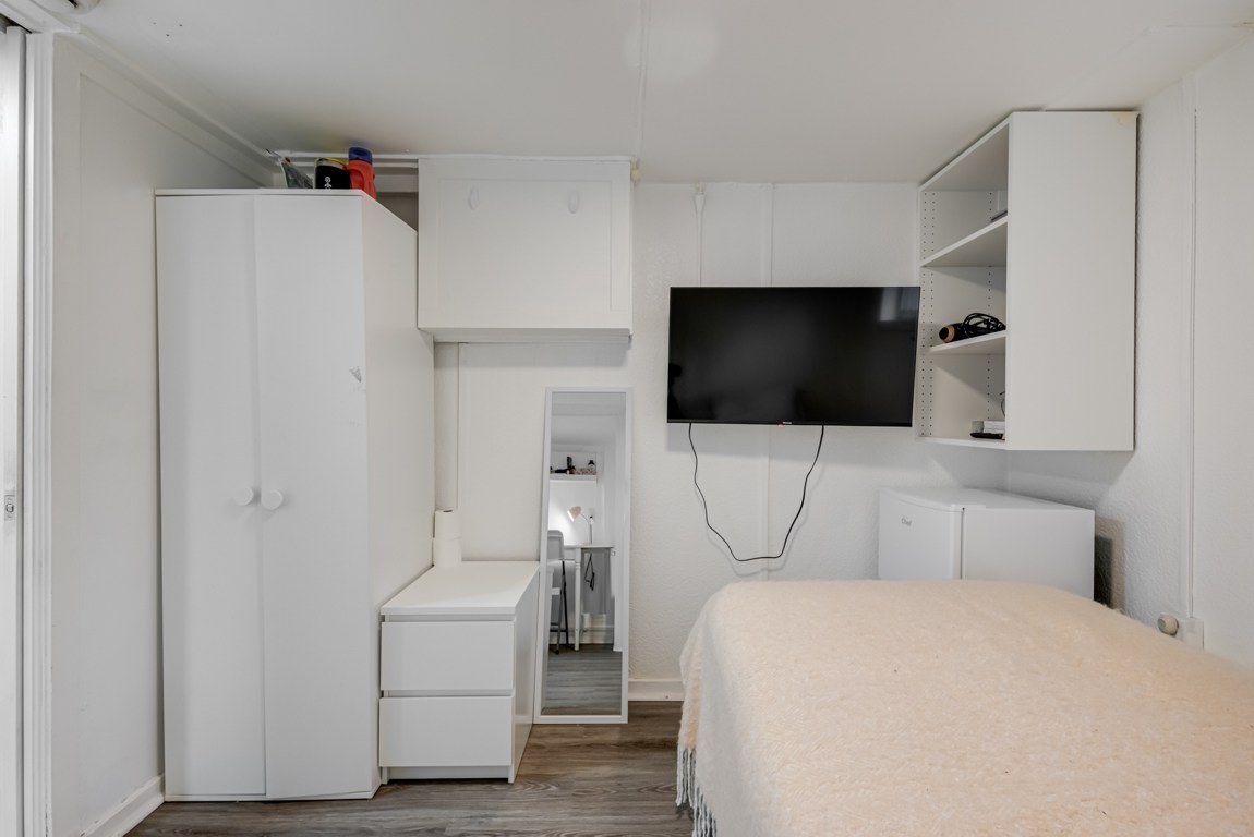 Third Downstairs Bedroom With Closet Shelves Cupboard TV And Fridge